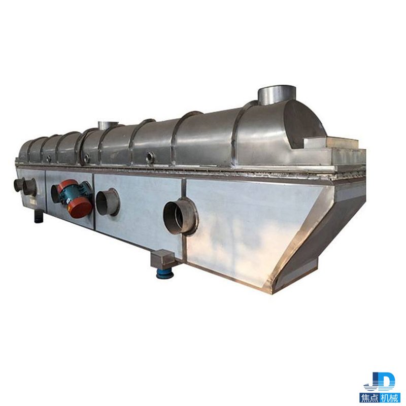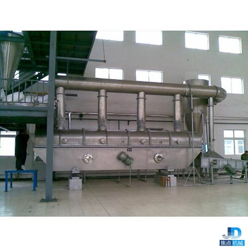 物料自進(jìn)料口進(jìn)入機(jī)內(nèi),在振動(dòng)力作用下,物料沿水平方向拋擲向前連續(xù)運(yùn)動(dòng)。熱風(fēng)向上穿過(guò)流化床和濕物料換熱,濕空氣經(jīng)旋風(fēng)分離器除塵后由排風(fēng)口排出,干燥物料由排料口排出。