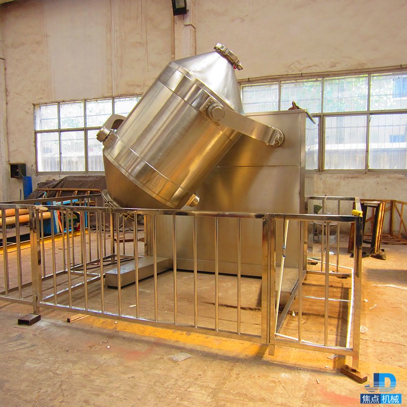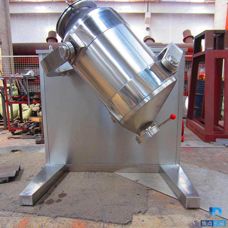 該機由機座、驅動系統(tǒng)、三維運動機構、混合筒,變頻調速電機,進料口出料口,電器控制系統(tǒng)等組成,與物料直接接觸的混合筒采用優(yōu)質不銹鋼材料制造,筒體內壁經(jīng)精密拋光。
